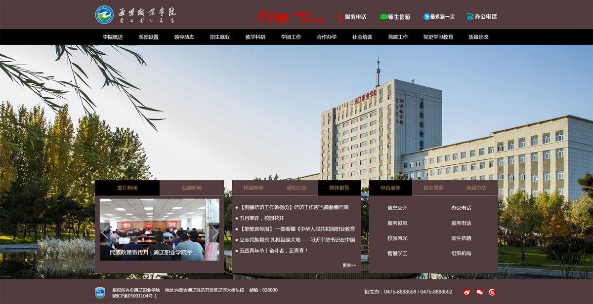 通遼職業(yè)學(xué)院是一所公辦全日制綜合性普通高等院校,以舉辦高等職業(yè)教育為主,兼?zhèn)渲械嚷殬I(yè)教育、電大開放教育和社會培訓(xùn)職能。學(xué)院成立于 2004 年,由原哲盟師范學(xué)校、哲盟衛(wèi)生學(xué)校、哲盟教育學(xué)院、內(nèi)蒙古電大通遼分校合并組建而成,辦學(xué)歷史始于 1951 年。2009 年通過教育部高職高專人才培養(yǎng)工作評估,現(xiàn)為內(nèi)蒙古自治區(qū)示范性高等職業(yè)院校、自治區(qū)園林式單位、自治區(qū)文明校園,是中國教育發(fā)展戰(zhàn)略學(xué)會產(chǎn)教融合專業(yè)委員會常務(wù)理事單位、全國高職高專校長聯(lián)席會成員單位。