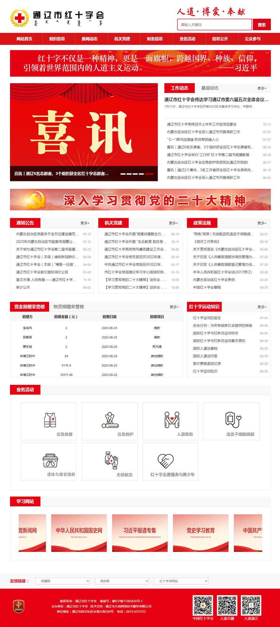 近年來,通遼市紅十字會(huì)在市委、市政府堅(jiān)強(qiáng)領(lǐng)導(dǎo)和自治區(qū)紅十字會(huì)的正確指導(dǎo)下,各項(xiàng)工作取得了長足發(fā)展。全市紅十字會(huì)系統(tǒng)年度籌資穩(wěn)定在1000萬元以上,8個(gè)旗縣市區(qū)全部突破100萬元,市本級(jí)多年穩(wěn)定在200萬元以上;自治區(qū)紅十字會(huì)“十四五”規(guī)劃重點(diǎn)項(xiàng)目建設(shè)高質(zhì)量推進(jìn),實(shí)施總會(huì)和自治區(qū)“博愛家園”項(xiàng)目,推進(jìn)建設(shè)紅十字示范校、應(yīng)急救護(hù)角、應(yīng)急救護(hù)點(diǎn)、人道文化傳播點(diǎn)、人道文化傳播基地、志愿者服務(wù)基地等重點(diǎn)項(xiàng)目;持續(xù)開展“博愛送萬家”“大病救助”“資助貧困學(xué)生”“光明行”等社會(huì)救助和公益活動(dòng),市紅十字會(huì)的社會(huì)影響力和公信力逐步提升,聯(lián)系服務(wù)群眾的橋梁紐帶作用和人道領(lǐng)域助手作用顯著增強(qiáng)。