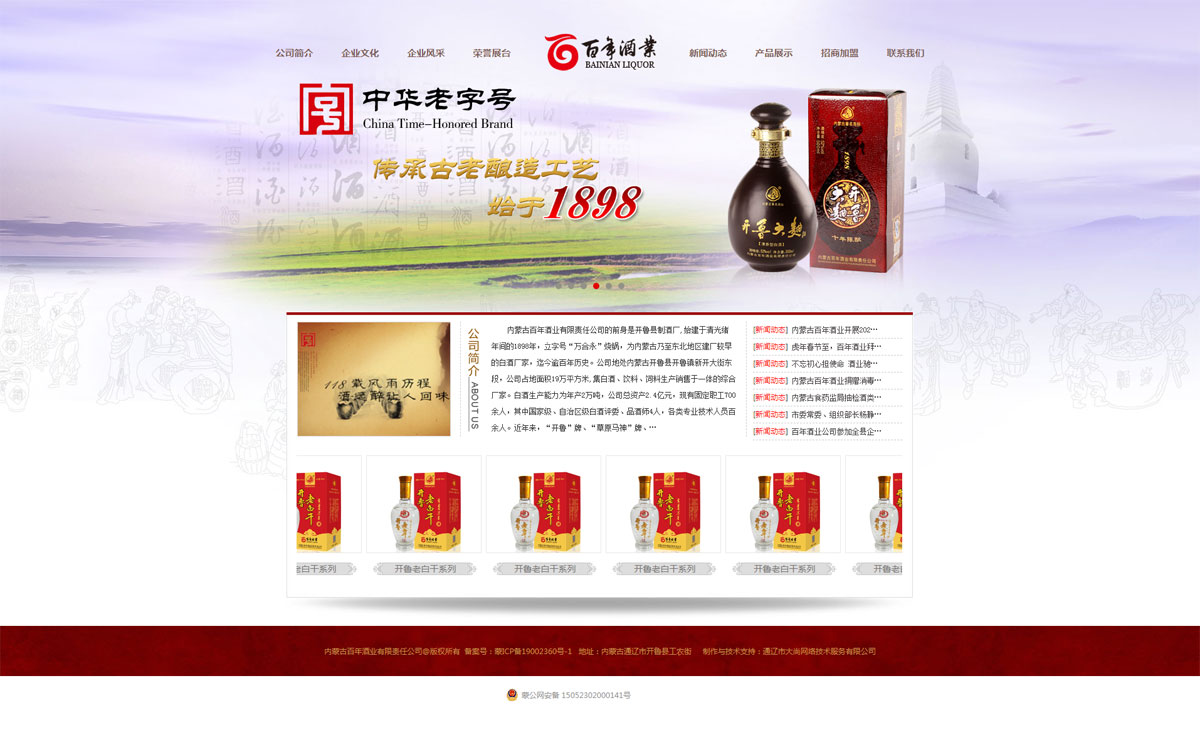 內(nèi)蒙古百年酒業(yè)有限責(zé)任公司的前身是開魯制酒廠,始建于1898年的“萬合永”燒鍋,迄今已有120多年釀酒歷史。企業(yè)歷經(jīng)了個(gè)體、國營、轉(zhuǎn)制的變革和發(fā)展,現(xiàn)已成為集白酒、木糖、飼料生產(chǎn)銷售于一體的自治區(qū)農(nóng)牧產(chǎn)業(yè)化重點(diǎn)龍頭企業(yè),是通遼域內(nèi)首家榮獲國家商務(wù)部頒發(fā)的“中華老字號”企業(yè)。